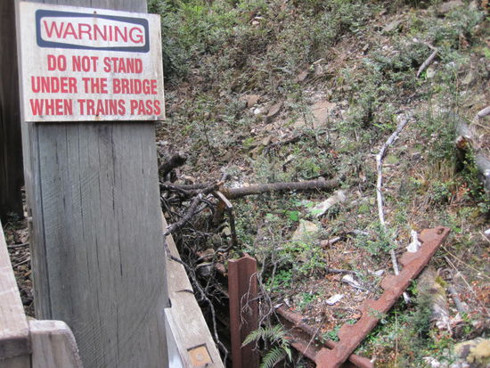 Die Bahn war Anfang des 20. Jahrhunderts gebaut worden, hauptsächlich um die Kupferbergwerke in Queenstown mit dem Hafen von Strahan zu verbinden. In den sechziger Jahren war sie dann dem Verfall preisgegeben bevor sie vor etwa 30 Jahren als reine Touristenbahn wieder neu eröffnet wurde. Die meist hölzernen Brücken mussten alle erneuert werden, manchmal sieht man den "Vorgänger" der gerade befahrenen Brücke noch im Fluß liegen. Auch bei den heutigen Holzbrücken wird vor herunterfallenden Teilen gewarnt (im Bild rechts ist ein Stück Zahnstange zu sehen).