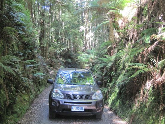 Zunächst ging es nach Queenstown. Dort biegt man am alten Empire Hotel links ab, dann rechts in die Conlan Street. Die Straße führt aus Queenstown hinaus und wird zur Mt. Jukes Road. Nach fast einer Stunde Fahrt geht die Straße in einen unbefestigten Weg über, dann kommt rechts die Abzweigung in das schmale letzte Stück des Weges, hier steht ein Hinweis "4WD only". Nun sind es nur noch 5 km; der Weg selbst ist gar nicht so schlecht, nur um Ausweichmöglichkeiten ist es nicht gut bestellt.