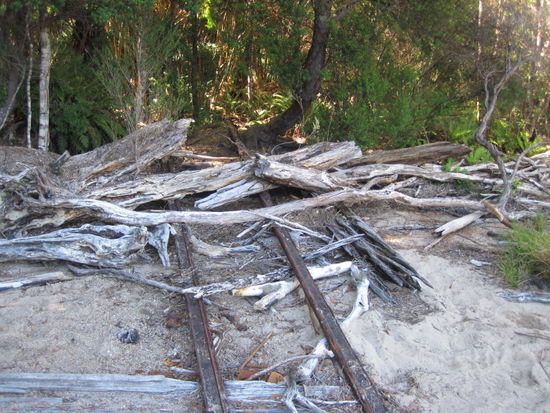 Langsam tauchen im dichten "Busch" Reste der Zivilisation auf, von Mauerresten über Dampfkessel und andere eiserne Teile, deren Bestimmung man kaum noch erraten kann. Am alten Pier endete die Bahn, die Schienen sind auch noch da, nur von den hölzernen Schwellen ist nicht mehr viel übrig.