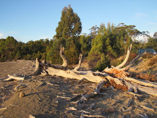 Als Krönung dieses erlebnisreichen Tages gab mir John von den Derwent Bridge Chalets noch den Geheimtip, zum Sonnenuntergang an einen sehr romantischen Strand am Südende des Lake St. Clair zu fahren. Der Weg ist zwar sehr holperig, aber auch mit einem "Soft-4WD" ganz entspannt zu bewältigen.