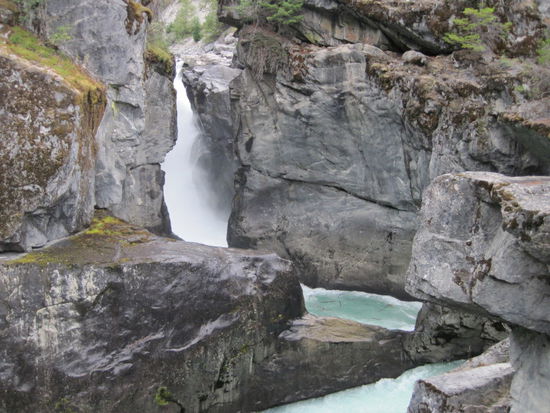 Heute muss ich zeitig los, denn bis zum nächsten Quartier in Clearwater sind es rund 600 km. Daher ist auch leider keine Zeit, im bekannten Whistler Station zu machen. Dafür lege ich an den Nairn Falls zwischen Whistler und Pemberton eine Pause ein. Hier führt ein kurzer Pfad zu eindrucksvollen Wasserfällen, wo das Wasser regelrecht durch ein Felsenlabyrinth gepresst wird.