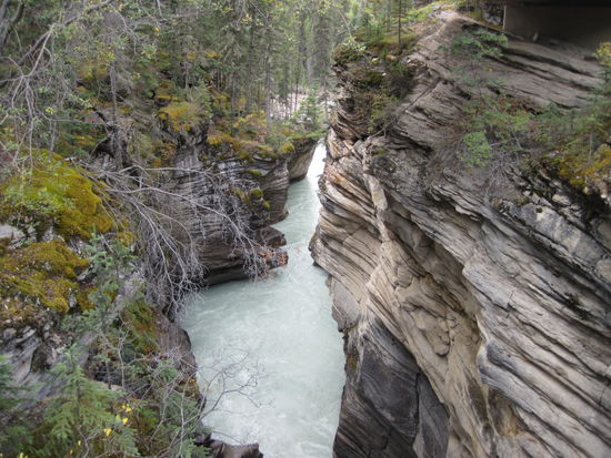 Wieder im Tal mache ich noch einen Abstecher zu den Athabasca Falls etwa 32 km südlich von Jasper. Nach den Wasserfällen folgt ein verschlungener Canyon.