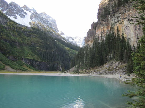 Im Informationszentrum am Ortseingang von Field ist zu erfahren, dass der Bus zum berühmten Lake O'Hara nicht mehr fährt, aber das hatte ich sowieso nicht vor. Heute geht es zurück nach Lake Louise und dort hinauf zum gleichnamigen See. Hier gibt es Parkplätze wie an einem großen Airport und die werden auch gebraucht. Das Luxushotel Chateau Lake Louise beherrscht das Südende des Sees. Wenn man dem Weg am Ufer folgt, wir es aber immer ruhiger. Am Ende des Sees führt ein Bergpfad, der "Plain of Six Glaciers Trail", in eine beeidruckende Bergwelt.