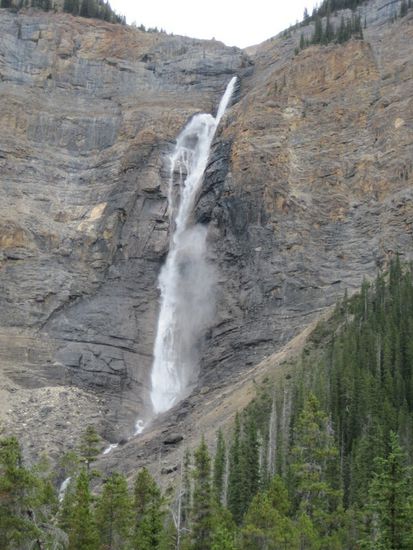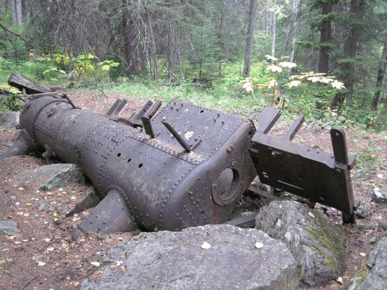 Field liegt praktisch mitten im Yoho Nationalpark, den ich heute besuchen möchte. Zuerst geht es in Richtung der Takakkaw Falls. Auf der Kartenskizze aus dem Informationszentrum war zu erkennen, dass gleich nach dem Abzweig vom Highway ein Wanderweg zu "Eisenbahnresten" abzweigt. Leider ist der Weganfang momentan nicht markiert, wahrscheinlich weil der Weg quer über die Baustelle einer Brücke des Highway führt. Nach einigem Suchen war er aber dann doch zu finden. Er windet sich durch dichten "Urwald", überquert die Bahnlinie, folgt dann für kurze Zeit nach rechts einer Forststraße Er endet an den Resten einer Lokomotive. Die Lok ist allerdings hier nicht verunglückt, sondern es handelt sich um eine schmalspurige Baulok, die nach Beendigung der Arbeiten hier wohl einfach "vergessen" wurde.