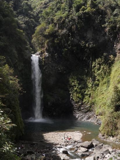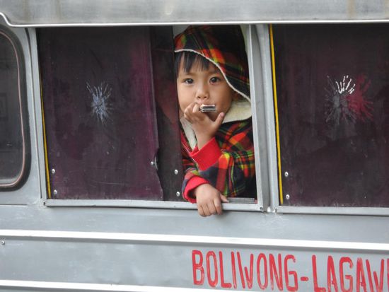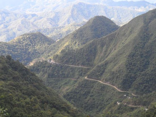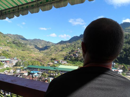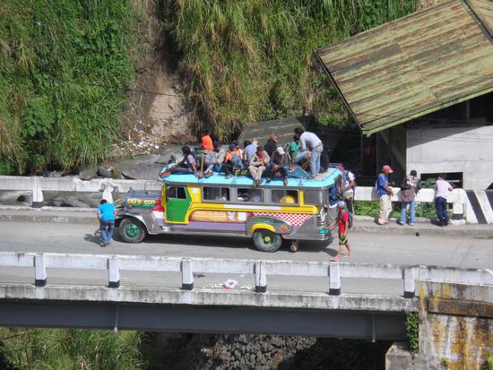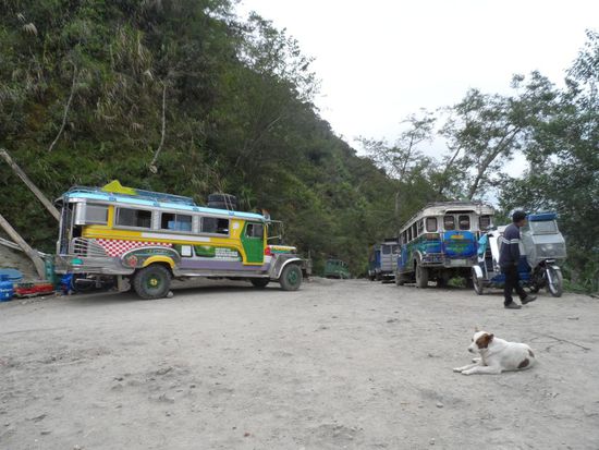 War gar nicht so einfach ein Taxi zubekommen. Es gibt in Manila keinen zentralen Busbahnhof sondern jede Gesellschaft hat ihr eigenes Terminal. Irgendwann hatten wir dann aber einen Taxifahrer der in etwa wusste wo sich das gesuchte Terminal befinden sollte. Nach einem ca. einstuendigen Kampf durch die Rush Hour Manilas erfahren wir dann das der Bus um 22h tatsaechlich ausgebucht war Aber es gab noch zwei Restplaetze fuer den 21h Bus, cool weniger Wartezeit. Etwas zu frueh gefreut, denn es sollte die schlimmste Busfahrt meiner Reise folgen. Es fing damit an das ich meinen Sitznachbarn fast auf meinem Schoss sitzen hatte, da die Sitze so eng waren. Zusaetzlich gab es von oben eiskalte Aircon waehrend uns von unten fast die Schuhsohlen geschmolzen sind (sassen direkt ueber dem Motor). Das kann ja heiter werden, an schlafen war nicht zu denken da man im Bus ordentlich durchgeschuettelt wurde. Nach 9 Stunden Fahrt gab es dann die erste und einzige Pause (fuer 10 Minuten). Bleibt noch zu erwaehnen das es natuerlich KEIN WC im Bus gab. Nach insgesamt fast 13 Stunden kommen wir endlich in Banaue an. Eigentlich haette die Fahrt 9 Stunden dauern sollen, aber wegen eines Unfalls oder einer Baustelle (???) ging zwischenzeitlich nix mehr.