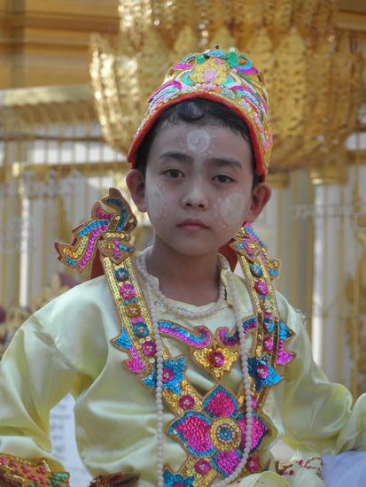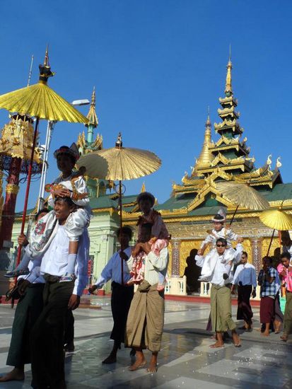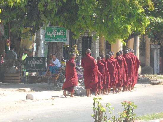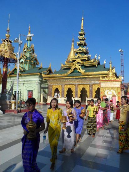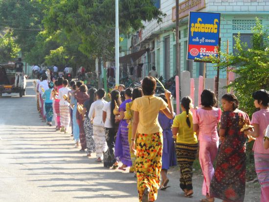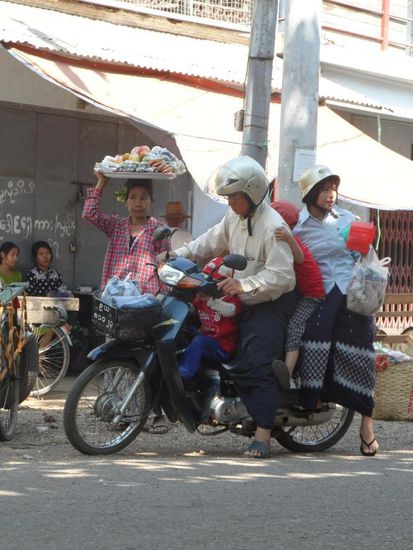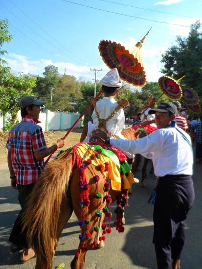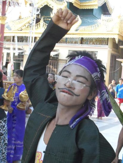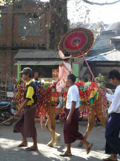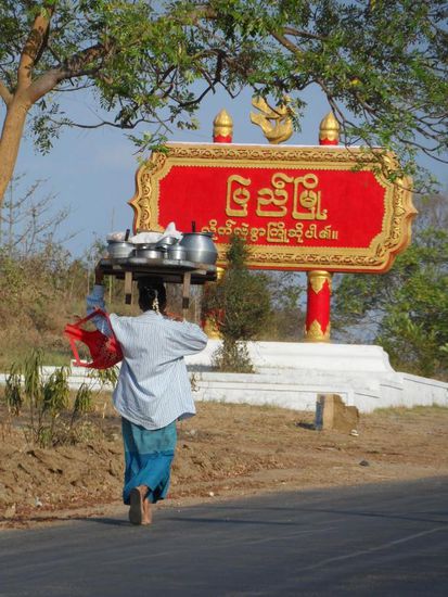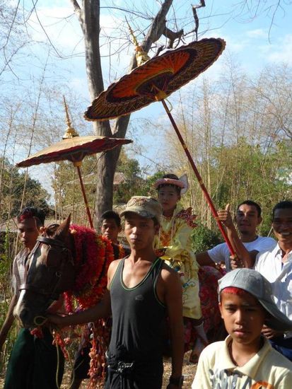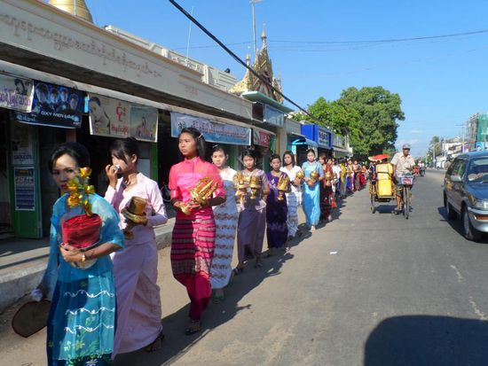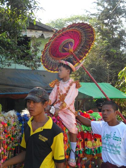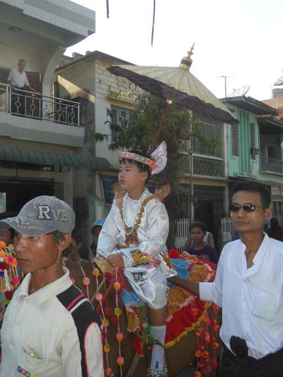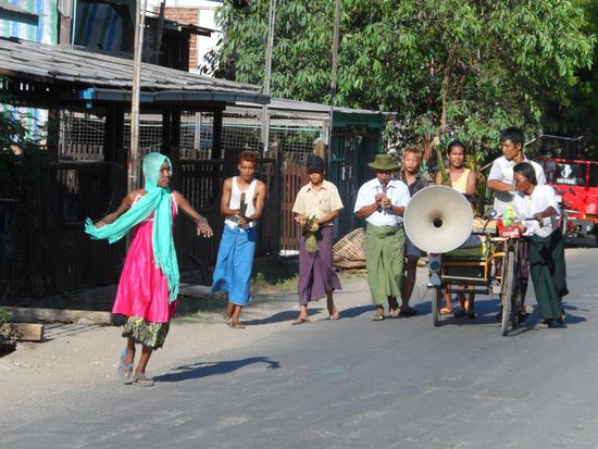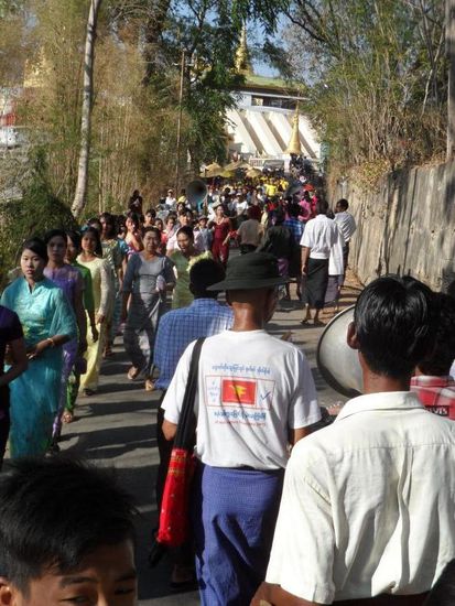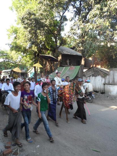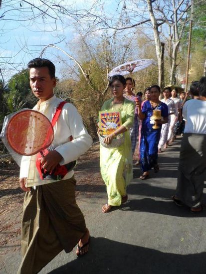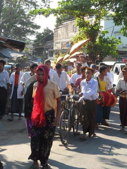 Zurueck am Musem haben wir uns dann von einem Motorradfahrer zur Hauptstrasse fahren lassen - hatte echt genug Sonne getankt. Von der Hauptstrasse bis Pyay haben wir dann einfach den Daumenexpress bemueht. War super unproblematisch. Nach 2 Minuten hat ein kleiner LKW angehalten und uns mit genommen. In Pyay haben wir eine Prozession gesehen. Ich war zwar von unserem Ausflug eigentlich total im Sack aber das wollte ich mir natuerlich nicht entgehen lassen. Also schnell runter vom LKW und hinterher.
