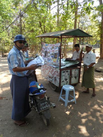 Seit dem es in Myanmar mehr oder minder eine Pressefreiheit gibt ist das Interesse an Zeitungen gross. Alles befindet sich jedoch noch im Anfang, viele Zeitungen erscheinen nur woechentlich und da die Kosten fuer eine Zeitung fuer viele Locals sehr hoch sind kauft man auch schonmal eine Secondhand Zeitung von vor 1 oder 2 Wochen.