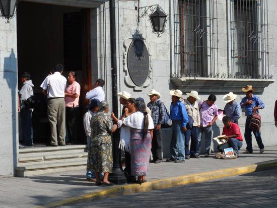 Mittlerweile habe ich jegliches Gefuehl fuer Zeit und Daten verloren. Wenn man jedoch eine lange Schlange von Mexikanern vor einer Bank sieht dann weiss man zumindest das es entweder der 1. oder der 16. des Monats ist. Da bekommen die Mexikaner naemlich ihr Gehalt