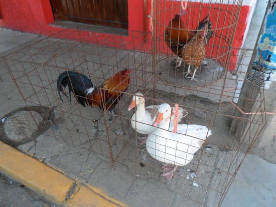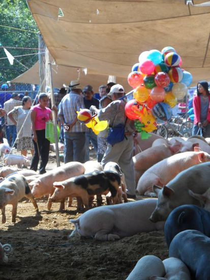 Apropos essen seit dem ich in San Cristobal den Film Lovemeatender gesehen habe, habe ich auch mal einen "sin carne jueves" (fleischlosen Donnerstag) eingefuehrt. Die Umsetzung auf dem Markt gestaltete sich etwas schwierig. "Essen ohne Fleisch? Aber probieren sie doch mal unser Fleisch ist so lecker." "Aeh nein Danke. Ich haette gerne etwas ohne Fleisch." Na ja nach einigen Minuten hat mir die Frau dann etwas vegetarisches vom Nachbarstand besorgt. Also mit etwas Hartnaeckigkeit bekommt man auch auf einem mexikanischen Viehmarkt ein fleischloses Mittagessen