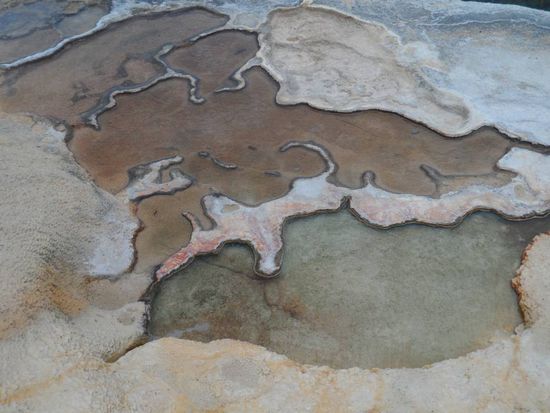 Hier sprudelt warmes Thermalwasser aus dem Felsen und bildet tolle Kalksteinablagerungen die aussehen wie ein Wasserfall aus Eis bzw. Riesentropfsteine