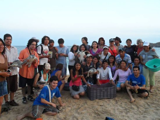 Abends konnte ich dann noch einem ganz besonderen Schauspiel beiwohnen. Mexikanische Studenten haben Schildkroeten aus der benachbarten Aufzuchtstation freigelassen.