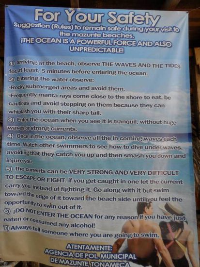 Der Strand sieht sehr cool aus, aber beim schwimmen ist Vorsicht angesagt. Im Gegensatz zum Nachbarstrand in Zipolite (Uebersetzt: Strand des Todes - hier ertrinken jedes Jahr zahlreiche Menschen) ist das schwimmen in Mazunte zwar deutlich sicherer aber immer noch nicht 100% ungefaehrlich. Daran erinnern zahlreiche Schilder.