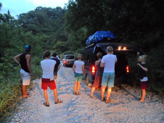 Das letzte Stueck der Strasse von Coban nach Lanquin ist nichts fuer schwache Nerven. Die Strasse ist von Schlagloechern uebersaeht und der Fahrer faehrt oft nur wenige Zentimeter vom Abgrund entfernt. Zwischendurch gabe es dann noch eine kleine Zwangspause da vor uns ein Shuttle liegen geblieben war und die Strasse versperrt hatte.