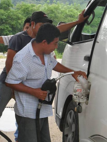 Nachschauen wieviel Sprit noch reingeht und dann schaukelt der hintere den Bus.......Das Tanken hat eine Ewigkeit gedauert da immer fuer ca. 20cent Sprit getankt wurde, Flasche rein, ok da geht noch was, schaukeln, fuer 20cent Sprit tanken, Flasche rein.......