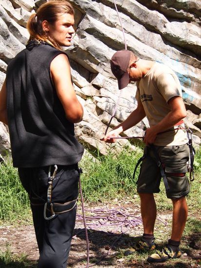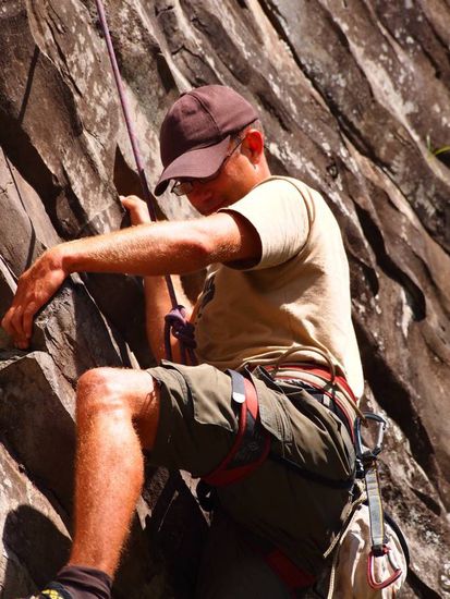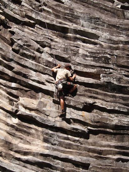 Da habe ich noch gut lachen. Diese Route (5.11b = UIAA 8-) ist dann doch zu viel fuer mich. 2m vor dem Ziel gibt es einfach kein Weiterkommen fuer mich. Der untere Teil hat einfach zu viel Kraft gekostet.