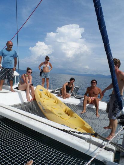 Endlich gehen wir an Bord der Nacar die uns in den naechsten 5 Tagen sicher nach Kolumbien bringen soll. Nach dem alle Vorraete verstaut waren und die Kabienen verteilt waren sind wir erstmal eine Runde schwimmen gegangen. Das Wasser war auch einfach zu verlockend. Spaeter paddel ich dann noch mit Fanny mit dem Kajak zu einer nahe gelegenen Insel um kuehles Bier zu besorgen, die Mannschaft will ja gut versorgt sein bevor es schon vor dem ersten Ablegen zur Meuterei kommt.
