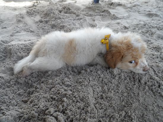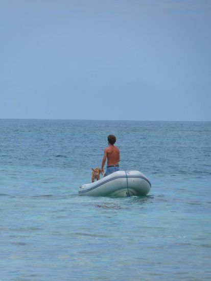 ueberquert diese. Pinkelt kurz, schaut dem Schlauchboot mit seinem Herrchen nach und springt am anderen Ende der Insel wieder ins Wasser und schwimmt Richtung Schlauchboot. Nach einigen Minuten kommt der Besitzer zur Insel gefahren um seinen Hund abzuholen. Wir zeigen ihm wo dieser gerade schwimmt und er macht kehrt um seinen Hund wieder einzusammeln: