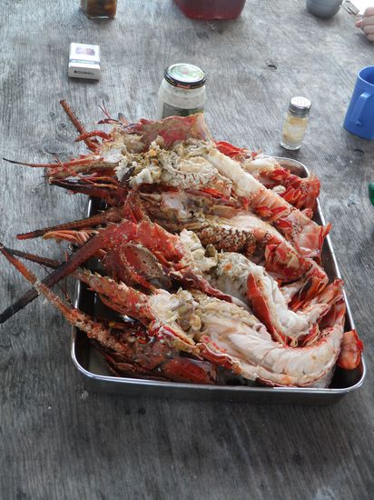 Nach dem Mittagessen kauft Fabian (unser Kapitaen) von den Kuna noch ein paar Langusten fuer das Mittagessen am naechsten Tag. Neben dem Verkauf von Kokusnuessen und Souveniers an Touristen die einzige Einnahmequelle fuer die Kuna und deshalb ein guter Grund wieso Fabian kein fischen waehrend der Tour erlaubt.