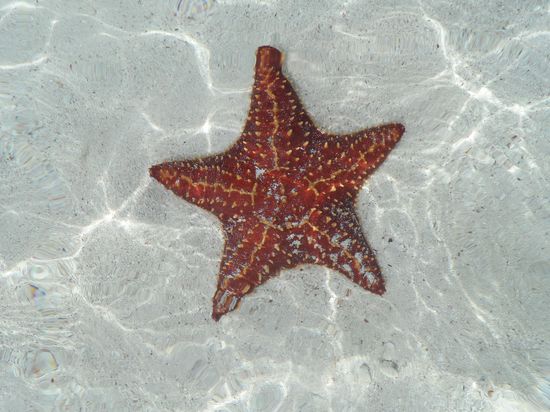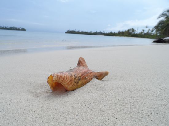 Vor dem Mittagessen schnorcheln wir noch ein bisschen vor der nahegelegen Insel und entdecken neben zahlreichen Seesternen auch das Skelet von einem Walfischkopf am Strand.