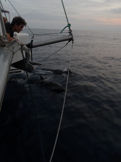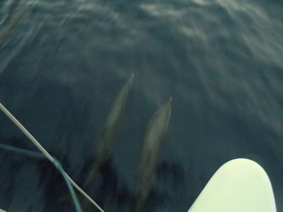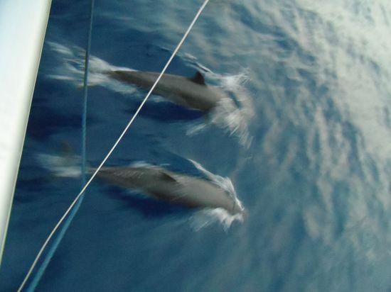 Als ich gerade so richtig schoen eingeschlummert war hoerte ich Fannys Stimme ueber meiner Luke "SVEN". Mein erster Gedanke, FUCK es ist irgendetwas passiert. Meine Hand schon halb an der Schwimmweste. Doch dann sagte sie nur "If you want to see the dolphins get up". Tja da habe ich mir schnell meine Kamera geschnappt und bin aus meiner Koje gehuepft. Und tatsaechlich drei Delfine schwammen am Bug unseres Katamarans und lieferten sich mit uns ein Rennen. Irre! Mit der Zeit kammen immer mehr Tiere hinzu. Zum Schluss waren es ein gutes Dutzend die vor uns herschwammen, aus dem Wasser sprangen, ueber einander sprangen und uns merkwuerdig beaeugten. Zwischendurch kam sogar noch ein Delfin mit einem Jungtier vorbei. Nach ca. 10 Minuten war das Schaupiel dann vorbei, von einer auf die andere Sekunde verschwanden die Delfine in der Tiefe. Danke Jungs fuers vorbeischauen!