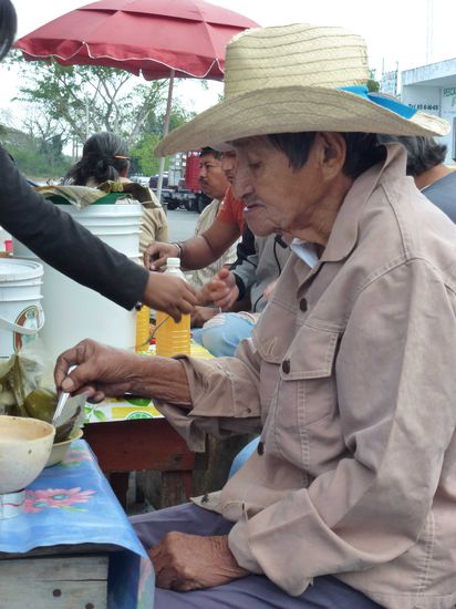 mexikanisches Fruestueck: Huehnchen mit Mais in Bananenblaettern gebraten und dazu ein sojamilchartiges Getraenk - lecker