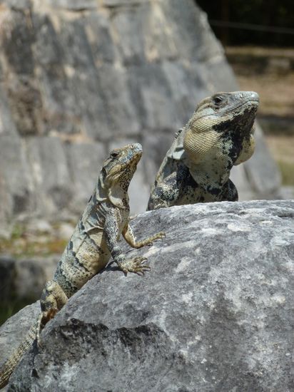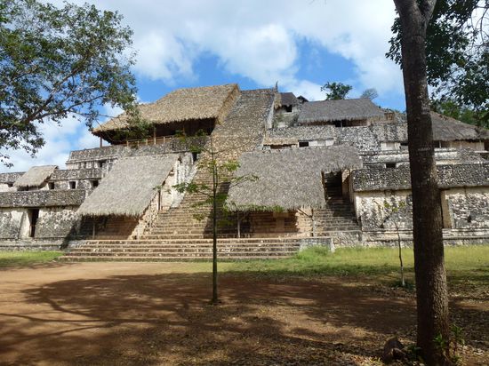 Am zweiten Tag habe ich einen Tagesausflug von Valladolid zu den Ruinen von Ek Balam gemacht. Auf dem Parkplatz vor den Ruinen stand nur ein einziger Bus - Meiers Weltreisen mit einer Gruppe aus Leipzig. Habe mich einfach mal unters Volk gemischt und mir eine gratis Fuehrung erschlichen. Immerhin war der mexikanische Fuehrer besser zu verstehen als die Reisegruppe