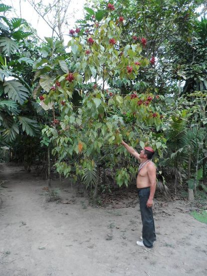 On one particular night, some of our shaman had a ritual and through a vision were able to see the use of the achiote seed as the salvation to overcome the bad spirits that were attacking our tribe; this being the reason that the Tsa'chila men still use the red tint in their hair today.