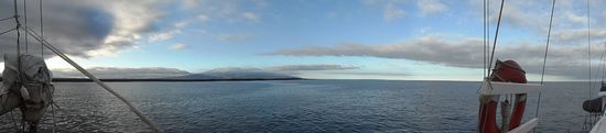 Egal morgens gab es dann erstmal einen tollen Ausblick auf die Insel (Vulkan...) und ein super gutes Fruehstueck (Muesli, Obst, Brot, Kaese, Schinken, Pfannkuchen, Saft).