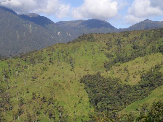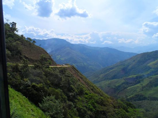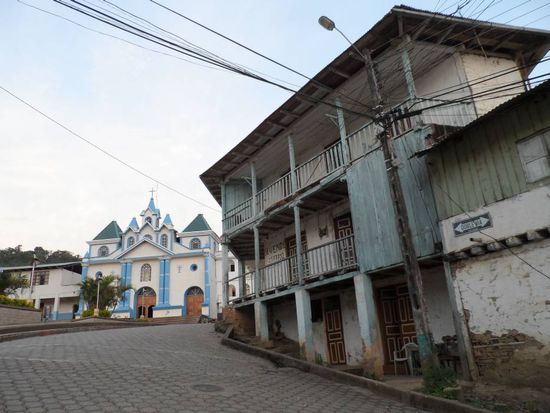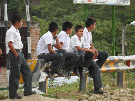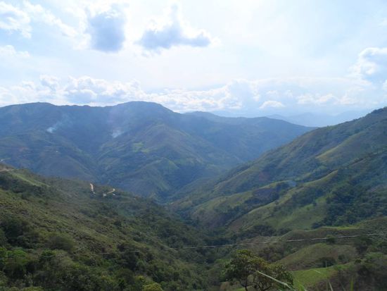 Habe eine eher unruhige Nacht in Zumba verbracht. Wurde gegen 4h durch ein Rascheln geweckt. Eine Kakalake und eine Ameisenhorde hatten sich ueber meine Vorraete hergemacht. Danach war an Schlaf nicht mehr zu denken. Um 6:15 ging es dann auf die letzte Etappe in Ecuador. 10km mit dem einzigen Bus des Tages (sonst fahren nur die seltsamen Rancheras). Die extrem kurvige Strecke zur Grenze ist super schoen. Mit Abstand eine der landschaftlich reizvollsten Strecken die ich bisher gefahren bin. Alles ist gruen, in den winzigen Doerfern gibt es hauptsaechlich alte Holz- und Lehmhaeuser und dazu gesellt sich noch ein toller Morgennebel. Auf der einspurigen Strecke kommen wir jedoch nur sehr langsam vorran - max. im 2. Gang. Beim Ueberqueren einiger winziger Bruecken bleibt mir fast das Herz stehen. Da wuerde ich in Deutschland nicht mal mit dem Fahrrad drueber fahren. Aber es ist ja alles gut gegangen.