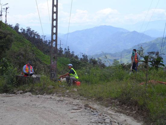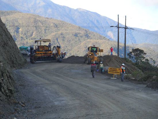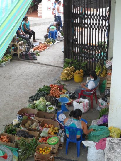 Da die Einreise bei mir etwas laenger gedauert hat sind alle Taxis (das einzige oeffentliche Verkehrsmittel hier) bereits weg. Es steht nur noch ein einsames Taxi an der Grenze und wir muessen noch auf 2 weitere Mitfahrer warten bis wir los fahren. Tja aber mitten im Niemandsland ist das nicht so einfach. D.h. wir muessen auf den ersten Ranchera aus Zumba warten, der gegen 9:30 eintreffen soll. Ok, also erstmal in Ruhe gefruehstueckt und ein paar $ in Soles getauscht. Sehe super viele Frauen die in eigentlich eher typischen Maennerberufen arbeiten: also Motoradtaxifahrerin und im Strassenbau als Ordnerin bzw. Fahrerin von Baufahrzeugen. Wow das haette ich hier nicht erwartet.