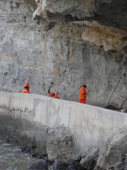 Aehhh da sind ein paar Felsbrocken runter gefallen. Aber die Jungs sind gerade dabei die klein zu hacken, sollte also bald weiter gehen