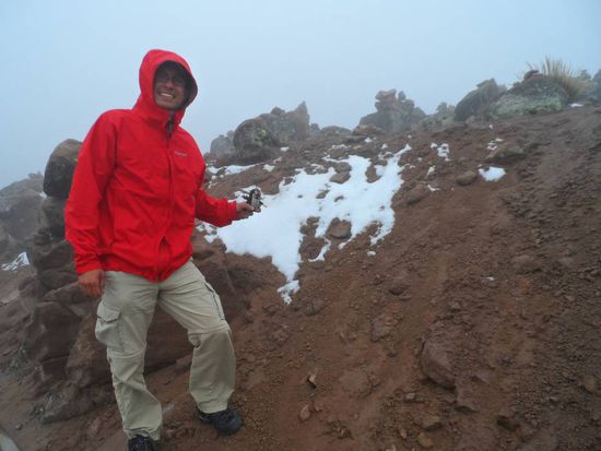 Zwischendurch habe ich noch eine persoenliche Hoehenmarke geknackt: 5000m. Zwar kein toller Ausblick wegen Nebel, aber dafuer gab es Schnee.