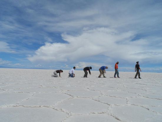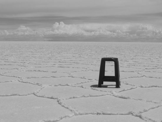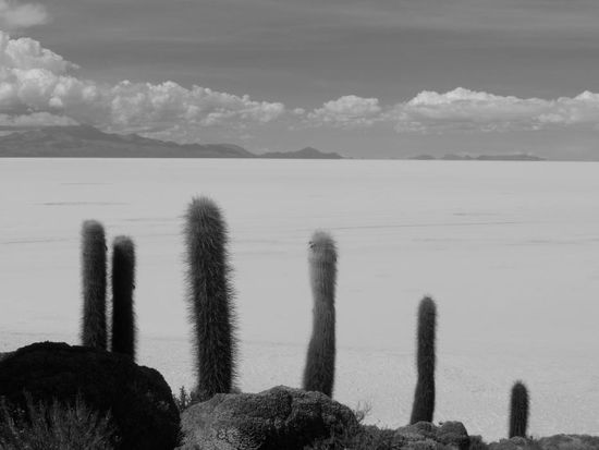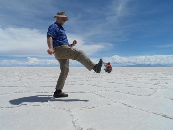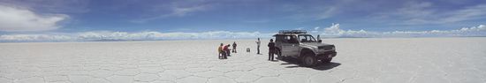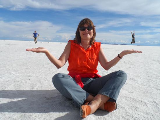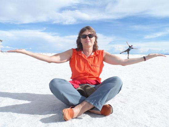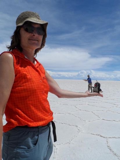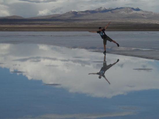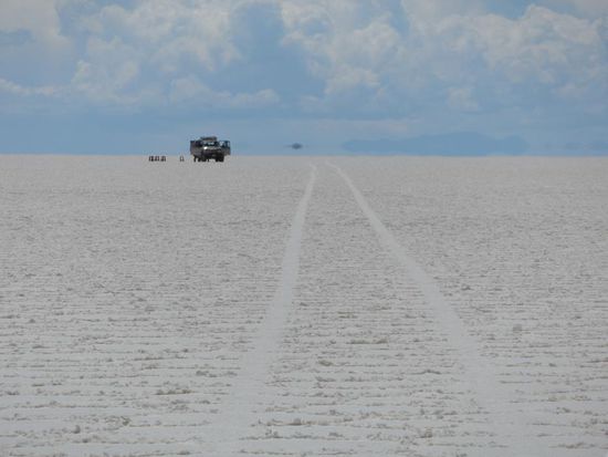 und noch viel viel viel mehr Salz........In der Mitte des Sees ist die Salzschicht bis zu 150m dick! Und wo kommt das ganze Salz auf fast 4000m her? Der Salzsee war frueher ein Teil des Urmeers, hat sich im Laufe der Jahre dann ein bisschen hoch gearbeitet und ist dann ausgetrocknet. Der Salar de Uyuni war uebrigens fueher auch noch mit dem Titicacasee verbunden.