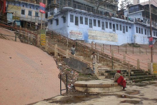 An den Ghats scheint niemals Ruhe einzukehren. Es ist immer viel los. Oft hat man den Eindruck durch das Wohnzimmer der Leute zu gehen. Viele machen es sich an den Ghats bequem. Sie führen dort jeden Tag ihre rituellen Waschungen im Ganges durch. Für uns unvorstellbar dort nur einen Finger hineinzustrecken, den in diesem Fluß befindet sich einfach alles. Er ist Waschstätte - für Körper, Geist und Wäsche - die Kühe gehen sich abkühlen und die Asche der verbrannten Leichen wird auch noch darin verstreut. Als wir die Ghats entlangschlenderten, sind wir schließlich am Verbrennungsghat gelandet. Es ist schon ein eigenartiges Gefühl, wenn man dort ist. Aber man hat auch dort keine Ruhe. Wir hatten schon bald einen Inder am Hals der uns in die Geschichte dieses heiligen Rituals des Verbrennens einführte. Es ist spannend dies zu hören, denn anscheinend werden am Tag bis zu 200 Verstorbene verbrannt. Die Verbrennungsstätten sind auch nach den Schichten der Menschen angeordnet. Am Fluß wir die unterste Schicht verbrannt und so geht dies bis nach oben wo die besser situierten Menschen ihre letzte Ruhe finden. Einfach unglaublich und dazu kommt noch, dass wir den Inder nicht mehr los wurden. Er erzählte immer weiter und weiter und wer sich dachte das er das umsonst macht hat sich getäuscht. Natürlich ist alles mit Geld verbunden.