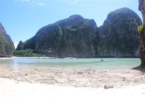 Am nächsten Tag dann hat Ole Geburtstag! Zum ersten Mal, und das kann man fast nicht glauben, so souverän und gelassen nimmt er die Glückwünsche seiner geburtstagstaumeligen Eltern entgegen. Als wir mit ihm zum Frühstücken ins Restaurant runter gehen, ist dieses mit Luftballons und anderer Geburtstagsdeko geschmückt, Patenonkel Matze sei Dank! Erstmal wird gefrühstückt, bevor es dann (leider ohne Sören, weil der vor 2 Jahren bewiesen hat dass er nicht so richtig seetauglich ist!) zu einem ½ Tagesauflug zur (aus dem Film The Beach) bekannten Maya Bay geht. Auf dem Weg dorthin wird bereits einmal Zwischenstopp zum Schnorcheln eingelegt. Als wir dann aber die Bucht der Maya Bay ansteuern bleibt uns allen der Atem weg... Wirklich traumhaft liegt der weisse Strand vor uns. Wir müssen die halbe Bucht durchwaten um an den Strand zu kommen weil das Wasser so niedrig steht. Hier wird eine der leckeren Mahlzeiten des Peace Paradise Resorts verspeist. Danach müssen wir das Longtailboot sogar aus der Bucht "schieben" weil das Wasser soo niedrig steht. Einmal wird noch auf der Rückseite der Maya Bucht geschnorchelt bevor wir uns wieder auf den Heimweg nach Ko Jum machen. Wir sehen einen Kugelfisch, eine Moräne, ca. 50 Zentimeter große Muscheln, bunt bewachsene Korallen, einen Weißkopfseeadler und sogar einen Eisvogel (was zum Teufel hat diese Gegend des Planeten mit Eis zu tun??). Nach ca. 1,5 Stunden Rückfahrt von hier, kommen wir wieder im Resort an. Tobias und Katharina haben Ole ein superschönes Muschelmobile während unserer Abwesenheit gebastelt, was Sie ihm nun schenken. Es ist Zeit mit der eigentlichen Geburtstagsfeier zu beginnen. Das Feuer am Strand wird mit Hilfe einer Plastikwasserflasche gezündet und nach guter Zeit Temperatur zu bekommen finden 5 ganze Fische (die am Morgen frisch gefangen wurden) und ein ganzes Huhn den Weg auf die Glut. Yummie... Das kann man auf jeden Fall als Geburtstagsschmaus gelten lassen. Allen schmeckt`s und wir schaffen es tatsächlich auch alles aufzuessen. Bevor das Essen aber auf den Tisch kommt geht zunächst Mal das Licht aus (wir dachten schon es wäre ein Stromausfall des Generators, der das Resort zumindest für den halben Tag mit Strom versorgt!), dann spielt die Musik eine Asiaversion von "Happy Birthday to you" und es wird für Ole ein Geburtstags-Pancake mit einer brennenden 1 - Kerze hereingebracht... Klasse! Danke Matze, war ne Superidee!! Schwuppdiwupp ist auch dieser tolle Tag wieder um und wir gehen zu Bett. Am nächsten Tag ist dann schon wieder Abreise angesagt und im Endeffekt sind wir auch ganz froh bald wieder etwas mehr Zivilisation zu erleben als in den letzten Tagen. Die Weiterreise geht für Alle über Ko Lanta. Für uns dann weiter Richtung Süden und für die 3 Freunde dann Richtung Norden. Wir beschließen aber noch am letzten Abend auf Ko Jum, die Unterkunft auf Lanta gemeinsam zu beziehen. Gesagt getan. Mittags ist Abreise und so wie wir von der Fähre ins Resort gekommen waren, geht es nun vom Resort retour wieder auf die Fähre. Ko Lanta wir kommen...