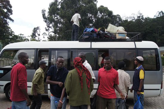 Am Anfang steht die Verwunderung: ein ganzer Bus ist zu unserem Hotel gekommen, dabei sind wir doch nur drei Kilimanjaro-Besteiger. Aber der kleine Bus ist voll besetzt. Insgesamt 15 Helfer gehen mit uns auf Tour, vom Fuehrer ueber den Koch bis hin zum einfachen Traeger. Nun wird mir auch klar, warum eine Kilimanjaro-Besteigung eine solch teure Angelegenheit ist (mindestens 1000 Us Dollar bei einem vernuenftigen Anbieter).