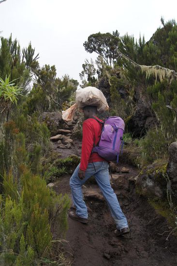 Eigentlich verboten (doch die Gewerkschaft der Traeger aht hier oben kein Buero): oft schleppen unsere Helfer 40 und mehr Kilo die steilen Wege hoch