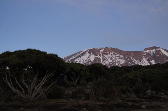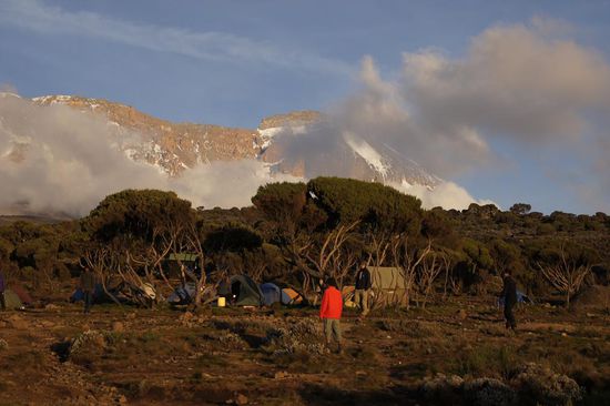 Als ich aufstehe, steht schon eine gruene Plastikschuessel mit heissem Wasser fuer mich bereit. Gesicht und Haende waschen, Zaehne putzen - mehr muss nicht sein bei der Besteigung des Riesen Afrikas. Der ueberaus warmherzige Kayembe kocht das wasser immer fuer uns auf - auch das Trinkwasser, denn unsere mitgebrachten Flaschen neigen sich bald dem Ende. Kayembe muss also immer iene Quelle finden, um uns mit Wasser zum Waschen und Trinken zu versorgen. Er bringt uns auch Kaffee, Tee und Fruehstueck ins Versorgungszelt. Wir staunen: der Koch hat ein Omelette gezaubert, dazu Chapati, Wuerstchen, Marmelade. Wahrer Luxus hier oben auf 2800 Metern. Und nun liegt der naechste Streckenabschnitt vor uns - wieder ungefaehr tausend Hoehenmeter auf fast 3900 Meter.