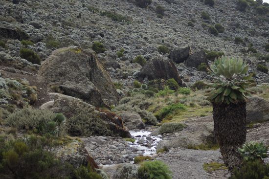 Ich verscheuche die Gedanken über die Sinnhaftigkeit meines Unterfangens schnell wieder. Jetzt bin ich schon mal hier, also auf, weiter. Pole pole zum Basislager, es geht wieder durch eine unwirtliche Geröllwüste. Aber ich fühle mich fit, bis auf ein paar Druckstellen an den Füßen, die mich etwas beunruhigen. Und auch Dominik ist weiter dabei. Gut so, zusammen ist es leichter, den Berg anzugehen. Ich bewundere Alain, einen 67jährigen Franzosen, der ganz allein das Abenteuer Kilimanjaro angeht. Einmal morgens sehe ich ihn auf einem Felsen stehen, auf einem Bein nur, er macht Tai Chi. Ich bin sicher: Alain wird es bis ganz nach oben schaffen.
