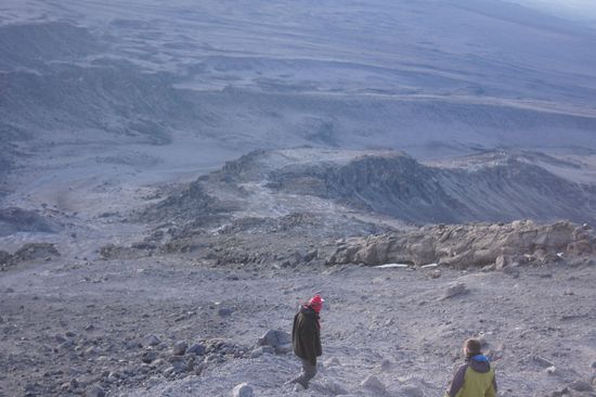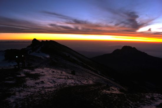 Felix sagt "ok", und wir gehen langsam wieder runter. Doch selbst dafür fehlt mir die Kraft. Nach rund 100 Höhenmetern lasse ich mich wieder auf den Boden sinken. Ich mache die Augen zu. Ich würde jetzt gerne schlafen. Als ich die Augen wieder aufmache, bietet sich mir eine unwirkliche Szenerie. Die Sonne geht gerade auf. Die Berge leuchten in wunderbarem Rosa. Noch unwirklicher ist die nächste Szene: Eine Gruppe wandert auf mich zu, ganz langsam. Zwei Führer und ein Pärchen. Anne und Dominik. Mrope spricht mich an. "Peter, was ist los?" - "Ich kann nicht mehr. Ich war auf Stella Point." - "Los, komm, geh nochmal hoch." - "Ich kann nicht mehr. Keine Energie mehr" Pole pole, ganz langsam ziehen Anne und Dominik an mir vorüber. Ich schließe die Augen. Was ist hier eigentlich passiert?