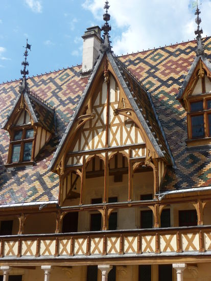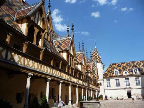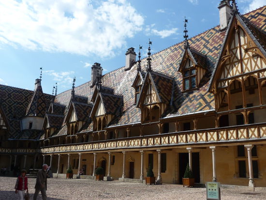 Nachdem die Nacht ziemlich unruhig war und sich ein heftiges Gewitter mit Regen und leichtem Hagel über uns austobte, scheint zum Frühstück bereits wieder die Sonne. Dank der willkommenen Abkühlung und dem schattigen Platz muss unser Vierbeiner heute den Wohnwagen hüten, denn wir wollen zu einem kulturellen Ausflug nach Beaune starten. Auf dem Tagesprogramm steht eine Besichtigung des Hospiz von Beaune, dem "Hôtel Dieu". Das Gebäude mit seinem charakteristischen, bunten Ziegeldach ist ein ehemaliges (Armen)Hospital aus dem 15. Jahrhundert und wurde noch bis 1971 als Krankenhaus genutzt. Gleich daneben befindet sich heute noch ein Seniorenheim.