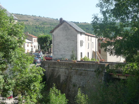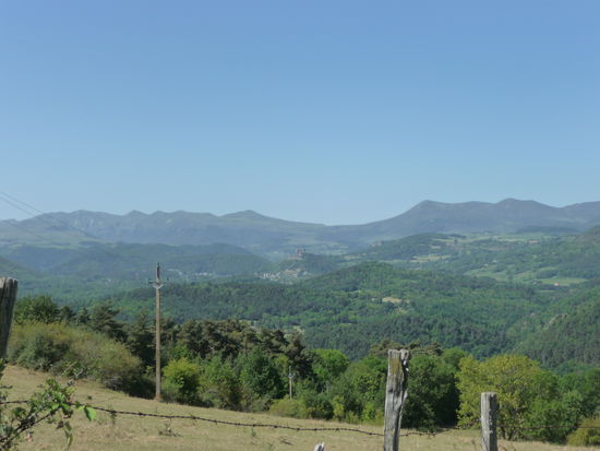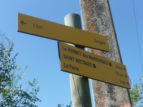 Ab Saillat geht's nun bergauf - und zwar nicht zu knapp. Zwar verläuft der Weg immer wieder in schattigen Waldabschnitten, aber trotzdem rinnt uns hier der Schweiß in Strömen. Dafür werden wir unterwegs immer wieder durch tolle Aussichten belohnt. Kurz vor dem Bergdorf Farges an der Route des Frommages ist unser Wanderweg durch einen Viehzaun abgesperrt. Was nun? In Sichtweite, aber auf der anderen Seite eines Bachlaufes, grasen imposante Rinder. Sollen wir es wagen und den Zaun ignorieren? Der Weg führt geradewegs über die Viehweide...... Aber wir sind fast oben und wollen nach dem strapaziösen Anstieg nicht wieder kehrt machen. Also Mut zusammen nehmen - schließlich haben wir einen ebenfalls imposanten Herdenschutzhund dabei - und den Zaun kurz aushängen. Wer nicht wagt, der nicht gewinnt. Unbeschadet erreichen wir dann auch eine Käserei, zu der wohl auch die Rinderherde gehört, und das Dörfchen Farges. Hier ruht alles im sommerlichen Mittagsschlaf. Alles? Nein, aus einem urigen Gebäude klingen viele Stimmen und Geschirrklappern. In einer ehemaligen Scheune samt dazugehörigem Innenhof ist ein Restaurant. Die Auberge "La Grange d'Alphonse". Zu dumm, dass wir gerade erst unser Picknick verspeist haben. Aber die Auberge wirkt so einladend, dass ich hineingehe und für den Abend einen Tisch reserviere. Wir wandern also weiter zurück in Richtung Saint-Nectaire.