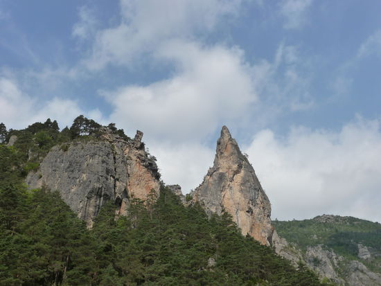Bei Les Vignes verlassen wir die D907, um hinauf auf die Hochebene Causse de Sauveterre und den dortigen Aussichtpunkt Point Sublime anzusteuern. In halsbrecherischen Kurven geht es hinauf, doch von oben haben wir eine grandiose Aussicht hinunter in die Gorges du Tarn. Wir schnüren hier die Wanderstiefel, um zu einer kleinen Rundwanderung aufzubrechen. Doch kaum haben wir den Parkplatz verlassen, da erschallt hinter uns ein lauter Donnerschlag. Beim Blick zurück stehen wir vor einer schwarzen Gewitterwand. Wo ist die bloß hergekommen? Auf der Hochebene besteht keine Chance, sich irgendwo unterzustellen. Also machen wir kehrt, nehmen die Beine in die Hand und spurten zurück zum Auto. Wo vorher noch etliche Ausflügler geparkt hatten, ist nun gähnende Leere und der Himmel öffnet über uns die Schleuse. Gerade noch rechtzeitig können wir uns ins Trockene retten.....
