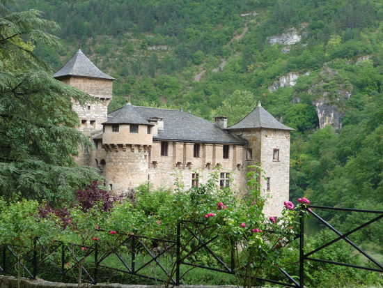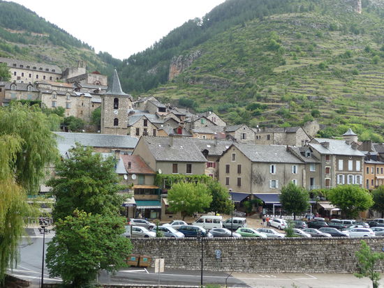 Das Unwetter zieht so schnell vorbei, wie es gekommen ist. Kurzzeitig glauben wir jedoch, dass wir hier von den Wassermassen vom Plateau gespült werden. Die Außentemperatur ist dramatisch nach unten gestürzt und bewegt sich hier oben kurzzeitig im einstelligen Bereich. Da wir kleidungstechnisch dafür nicht ausgerüstet sind, verzichten wir auf die Wanderung, werfen die Heizung an und setzen unsere Rundfahrt fort. Bei La Malène erreichen wir wieder die Gorges du Tarn und wir folgen der D907 bis Sainte-Enimie. Ein hübsches, mittelalterliches Dorf, in dem wir unser Auto abstellen und das wir nun zu Fuß erkunden. Allmählich knurrt uns auch der Magen, wir stärken uns mit einem Kaffee und kaufen noch ein Stück Käse, Salami und Brot. Wegen eines LKW-Unfalls ist unsere ursprünglich geplante Rückfahrt über die Causse Méjean ab Sainte-Enimie leider nicht möglich. Deshalb fahren wir ein Stück entlang der D907 zurück und bewundern die Gorges du Tarn nun aus einer anderen Perspektive.