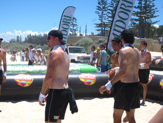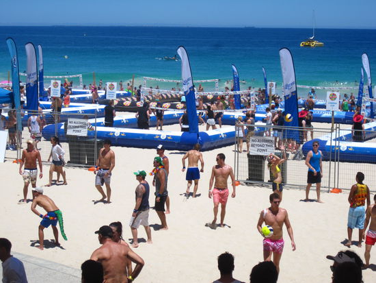 Da sind wir scheinbar in ein riiiiiesiges Beachvolleyballmatch reingerannt. Da gab es sogar witzige Kostueme...