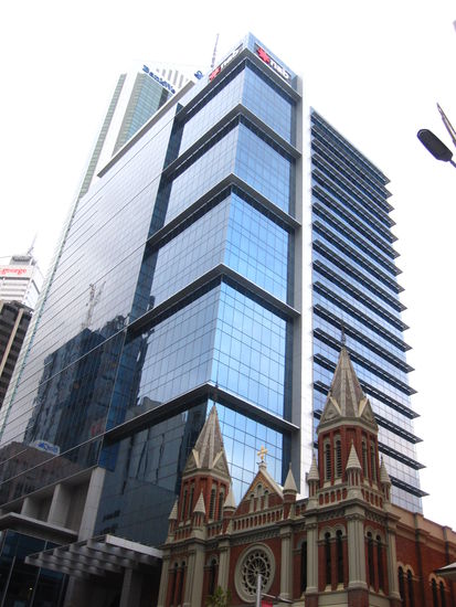 Auch hier: schoene Erinnerungen an die Bauweise australischer "Gross-"Staedte, wo moderne GEbaeude neben kleinen Kirchen stehen, die ebenso in einem vergessenen Dorf stehen koennten.