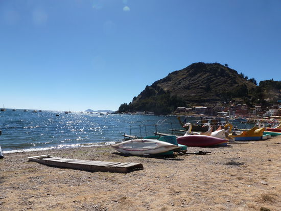 Nach dem ich schon viel laenger als geplant in Peru geblieben bin hab ich es doch noch nach Bolivien geschafft, der Titicacasee ist ja auch nicht so weit von Cusco entfernt. Copacabana heisst mein erster Halt was in der Sprache der Aymaras so viel wie "Sicht auf den See" heisst. Der kleine gemuetliche Ort mit ca.6000 Einwohner liegt auf 3800m.ü.M am Titicacasee und ist einer meiner Lieblingsorte. Das Atmen faellt einem in dieser Hoehe noch etwas schwerer und die Sonne brennt unglaublich stark vom Himmel deshalb hab ich mir fuer hier nicht allzuviel vorgenommen. Die Strasse die zum Hafen fuehrt ist vollgepackt mit Souveniershops, Hosteles, Restaurantes und Cafes immer noch gleich wie bei meinem letzten Besuch hier. Die Spezialitaet von hier ist natuerlich Forelle aus dem Titicacasee, die ganz lecker sind. Ansonsten ist Copacabana der Ausgangspunkt um die Inseln "Isla del Sol" und "Isla de la Luna" zu besuchen wo es Inkaruinen gibt, was ich aber aus lies.