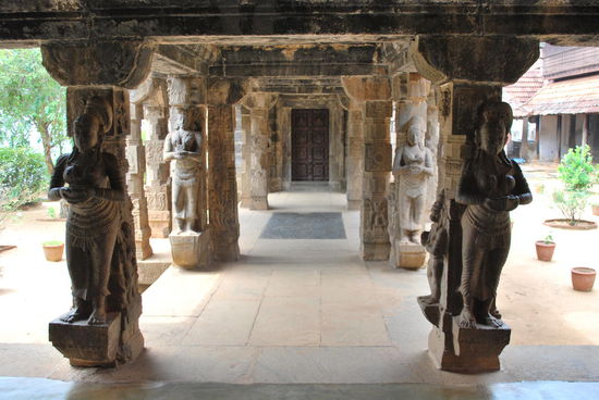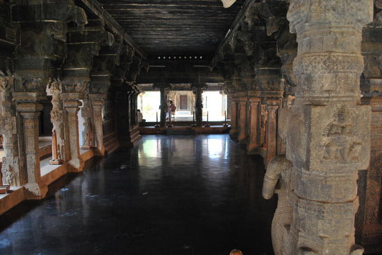 Der nächste Stopp ist an einem bedeutenden Hindu-Tempel mit eindrucksvollem Gopuram. Das sind diese sockelartigen Aufbauten auf dem Dach von Hindu-Tempeln. Ich kenne sie bisher eigentlich nur in kreischbunt, aber hier in Südindien scheinen sie normalerweise nicht mit Farbe bepinselt zu sein. Ich darf den Tempel zwar betreten, muss aber meine Kamera draussen lassen, was total schade ist, denn dieser Tempel ist riesig, hammer-interessant und irgendwie auch unheimlich, denn im Inneren ist es ziemlich düster. Inder sind immer um das Karma ihrer Mitmenschen bemüht, wie ich feststelle, denn irgendjemand drückt mir eine Handvoll Blüten in die Hand, die ich in irgendeinem wohl Glück bringenden Schrein verstreuen soll und drückt mir anschliessend einen roten Punkt auf die Stirn. Soviele rote Punkte, wie ich schon während meiner 3 Indien-Reisen auf die Stirn gedrückt bekommen habe, muss ich ein wandelndes Glücksschwein sein und mein Karma kaum noch zu toppen... Dabei habe ich immer gedacht, dass der rote Punkt nur das Zeichen für eine verheiratete Frau ist. Und das bin ich ja nunmal überhaupt nicht und nie gewesen. Aber wahrscheinlich wird hier einfach nur ein Klischee bedient und Touristen kriegen den roten Punkt, weil sie sich was drauf einbilden oder sich drüber totfreuen oder whatever. Naja, ist auch eine abstruse Theorie. Warum auch immer: Ich habe wieder den roten Klecks auf der Stirn und mein Fahrer freut sich...
