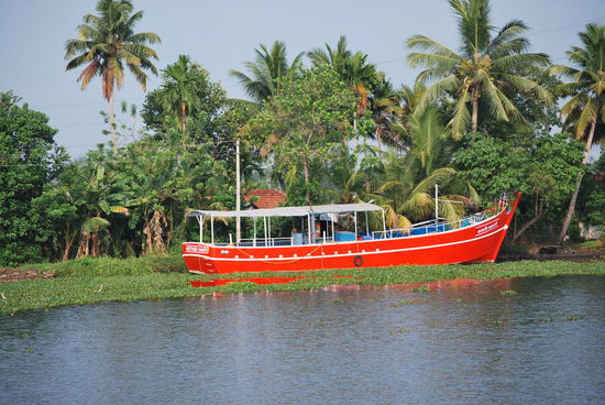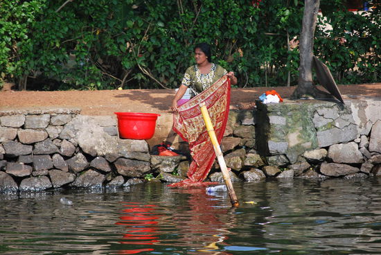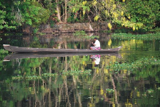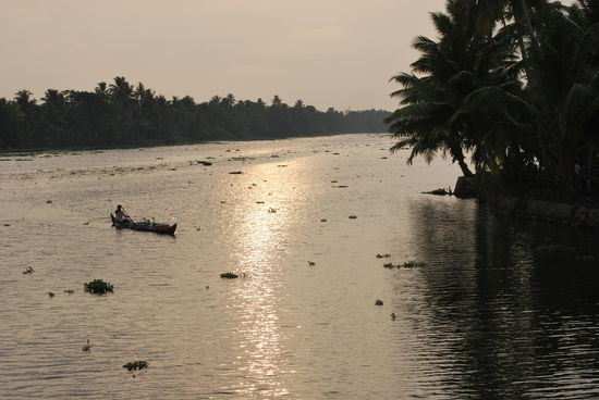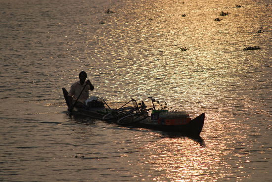 Kennt Ihr das Buch "Der Gott der kleinen Dinge" von Arundhati Roy ??? Wenn nicht: Lesen ! Dieses Buch ist der Kerala-Roman schlechthin. Ich befinde mich jetzt auf meiner persönlichen "black pearl", habe meine Klamotten in meine Koje geschmissen, meine Kamera herausgepult und mich mit leatherman bewaffnet auf´s Oberdeck gefläzt, um nun in aller Ruhe einen Apfel zu schälen und das Teil in winzigste Stückchen zu zerlegen,um es langsam meinem gebeutelten Magen zuzuführen. Wie gesagt: Geraspelter Apfel ist normalerweise meine Zauberwaffe gegen Durchfall, aber hier kann ich nicht maschinell raspeln, sondern muss mit dem Taschenmesser kunstvoll schnitzen. Ich frage den Matrosen nach Cola - mein zweites Rezept gegen Durchfall - aber er sagt, es gäbe an Bord nur Wasser. Cola etc. müsste ich unterwegs kaufen. Egal.