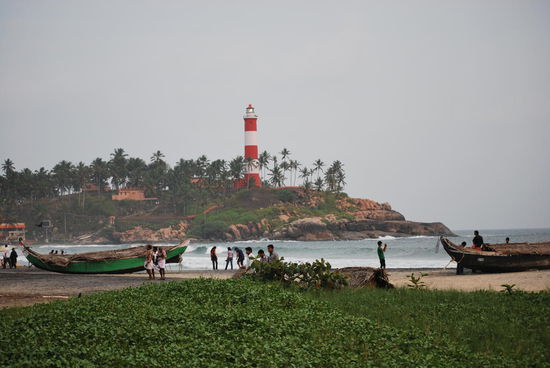 Von Alleppey aus sind wir ungefähr 6 Stunden unterwegs nach Kovalam. Der Verkehr ist echt irre und die Überholmanöver finde ich eigentlich hirnkrank, aber es funktioniert einwandfrei. Mein Fahrer fährt wirklich versiert und einigermaßen defensiv. Angekommen in Kovalam, beziehe ich mein Zimmer, das wieder sehr groß ist. Ein Flachbildfernseher und Satelliten-TV ist vorhanden, das Bad ist ok, ein Kühlschrank ist da, ein großer Balkon, es fehlt einzig ein Moskitonetz - und das wäre dringend nötig gewesen. In Asien habe ich noch nie Malaria-Prophylaxe betrieben, aber ich habe normalerweise Malarone wenigstens als stand-by-Mittel dabei. Tja, normalerweise: Ich hab´s zuhause vergessen. Nicht zu ändern und ja auch kein Grund zur Panik. Ich verschaffe mir einen ersten Eindruck von meiner neuen Umgebung. Über viele Treppen und Stufen erreicht man die Strandpromenade mit all den Restaurants und Geschäften. Am Strand sind auch Fischer zugange und es gibt natürlich den Leuchtturm, nachdem der Strand - lighthouse beach - benannt ist.